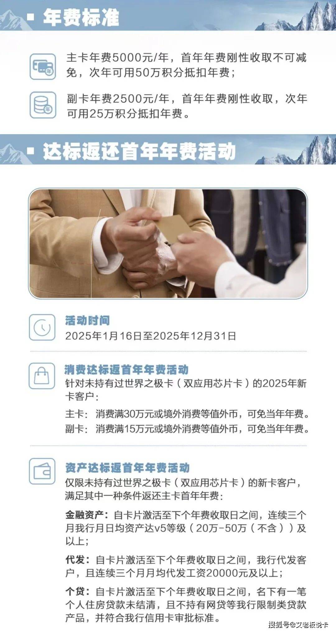 1万放3个月减免首年年费◆■★■,或者消费达标1年内满足有3个月每月消费满1万元,或满足有6个月每月消费满5000元,或连续12个月每月消费满2500都可减免。